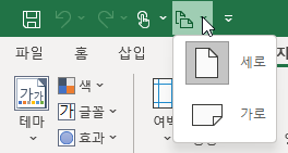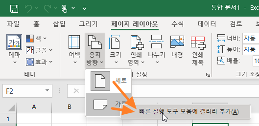 페이지 레이아웃 > 용지방향에서 세로나 가로를 우클릭하고 빠른 실행에 추가하세요.