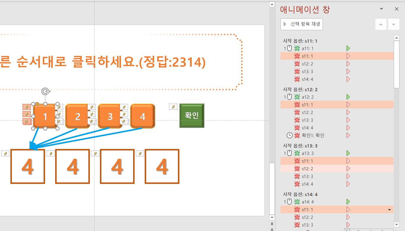 4자리 비번입력에서 맨 앞자리의 경우만 예를 들면 1,2,3,4 도형을 누를 때 해당 숫자가 첫번째 빈칸에서 나타나기 애니메이션을 적용하고 트리거를 지정해줍니다. 동시에 다른 숫자는 사라지기 애니메이션을 추가해줍니다.