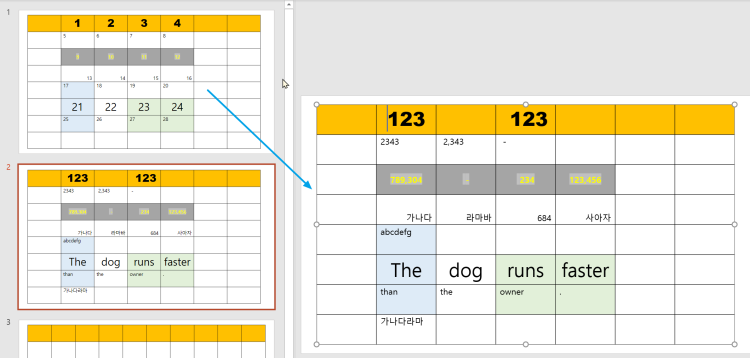 슬라이드의 표 안에 현재 선택된 셀 위치에 각각 붙여넣어줍니다.