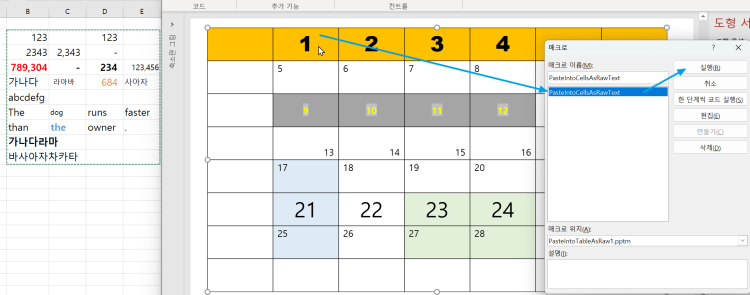 이번에는 PasteIntoCellsAsRawText2 를 실행하세요.