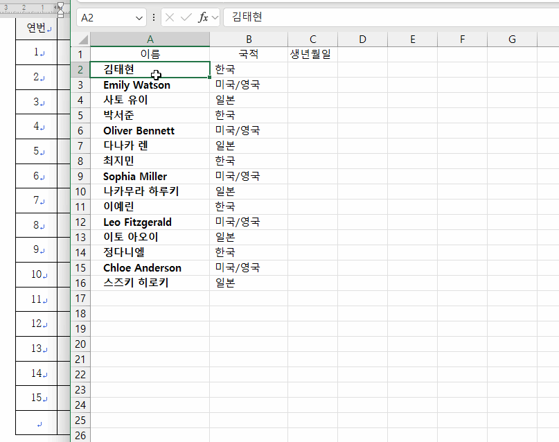 엑셀시트에는 아래처럼 이름이 정리되어 있습니다.
