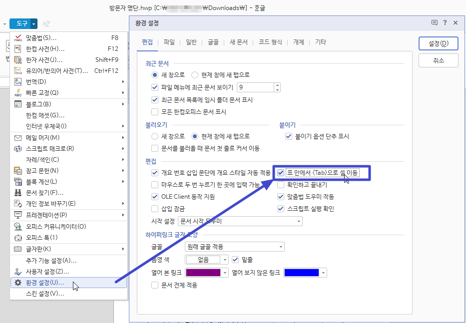 아래한글 도구 메뉴 > 환경설정에서 표 안에서 <TAB>키로 다음 셀로 이동할 수 있게 설정되어 있어야 합니다.