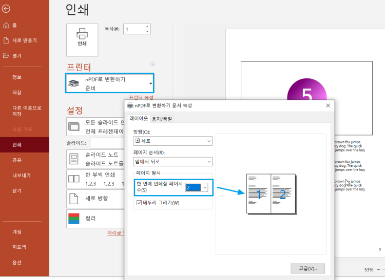 그 다음 파일 > 인쇄에서 nPDF 등의 가상 PDF 프린터로 인쇄할 때 한 페이지에 2, 4, 6 페이지 인쇄 등을 이용해서 인쇄하면