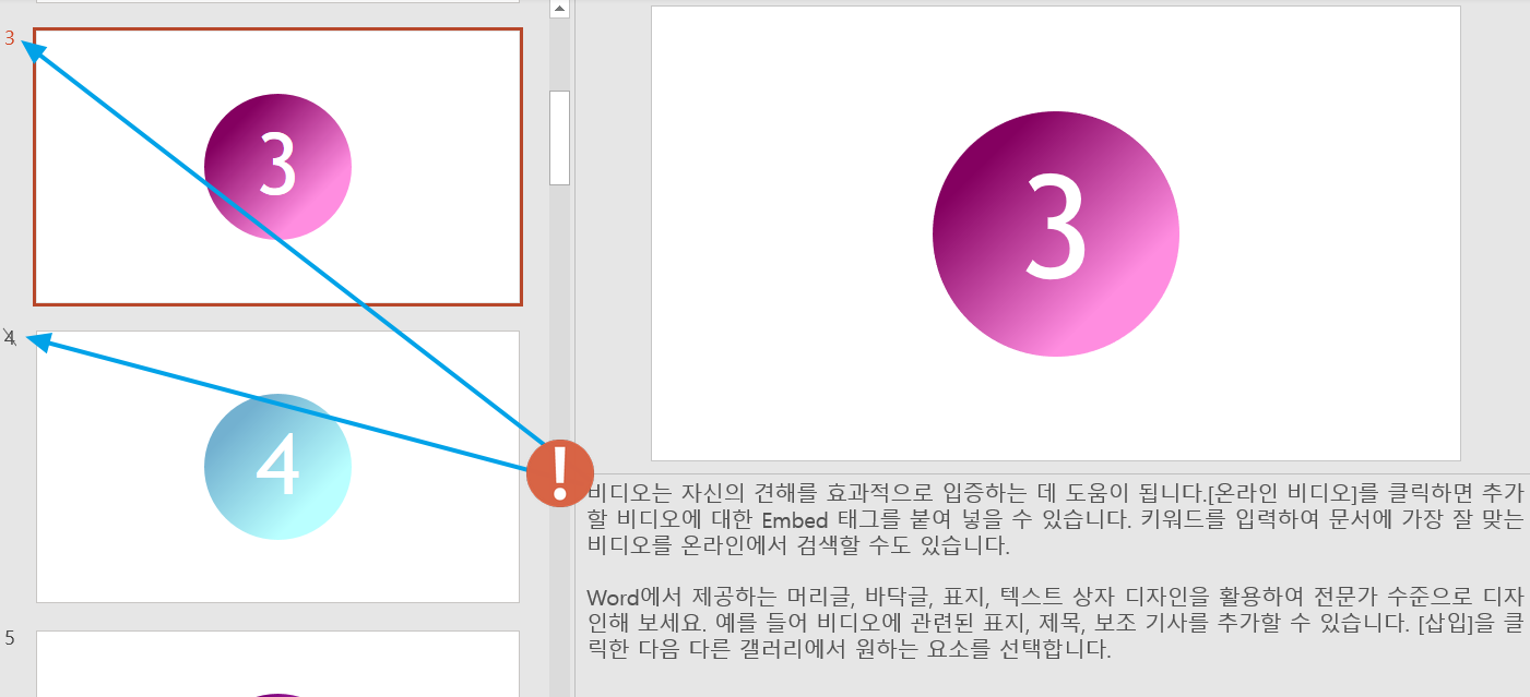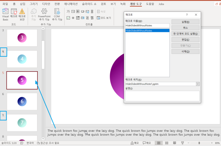 매크로를 실행해서 슬라이드 노트가 없는 4, 7 슬라이드 등은 숨김처리해서