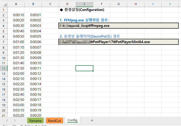B열의 시간들은 1차적으로 나눈 영상에서 최초 가져올 시간길이 목록입니다.