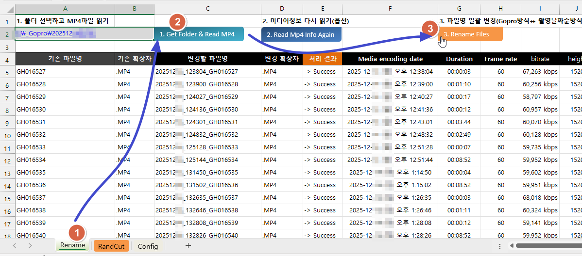 폴더내의 영상에 대한 미디어정보와 변경될 파일명이 뜨는데 이 때 Rename Files버튼을 눌러 파일명을 시간순서대로 정렬합니다.