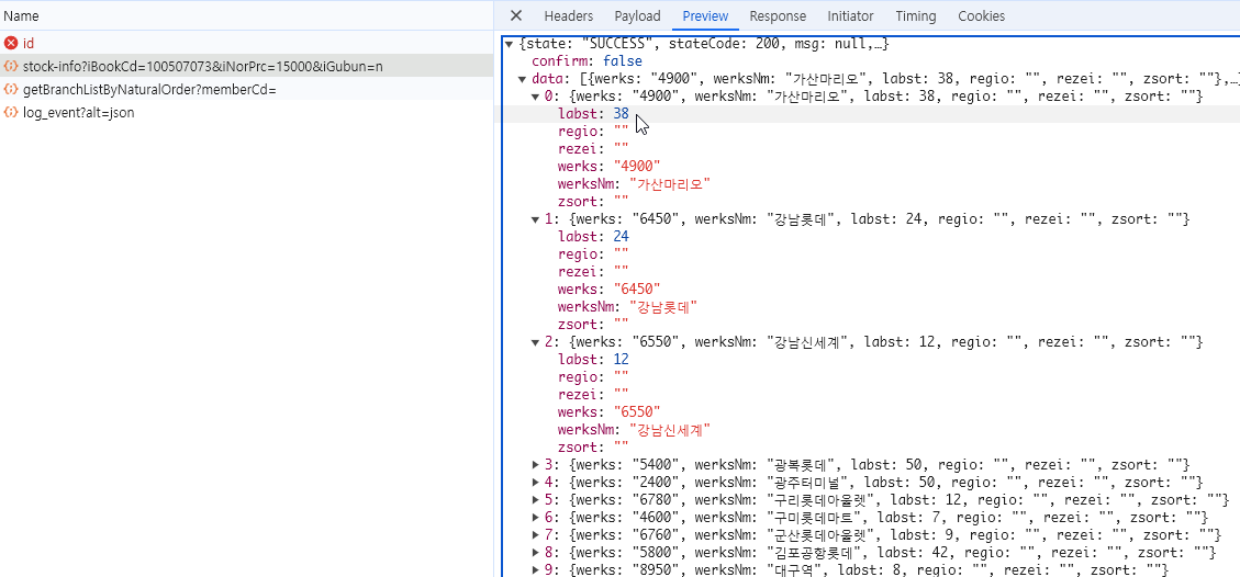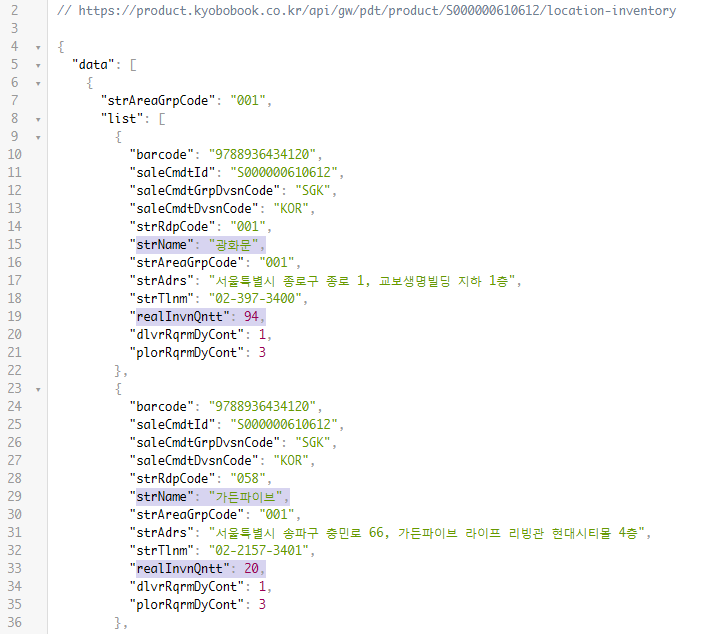 이제 최종적으로 https://product.kyobobook.co.kr/api/gw/pdt/product/S000000610612/location-inventory 이런 주소로 접속해서 매장별 재고 숫자를 가져옵니다.