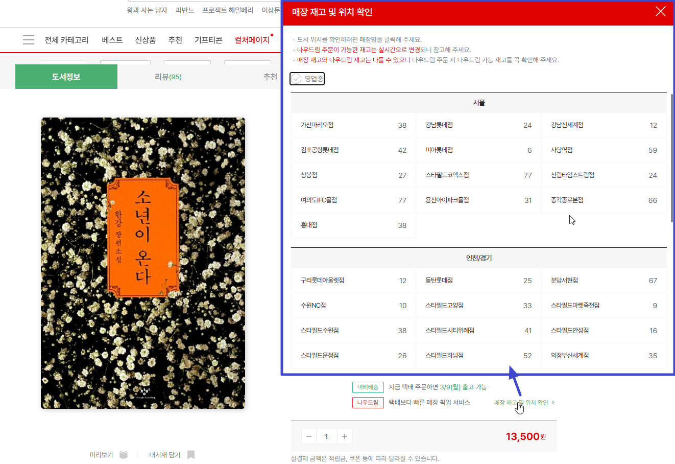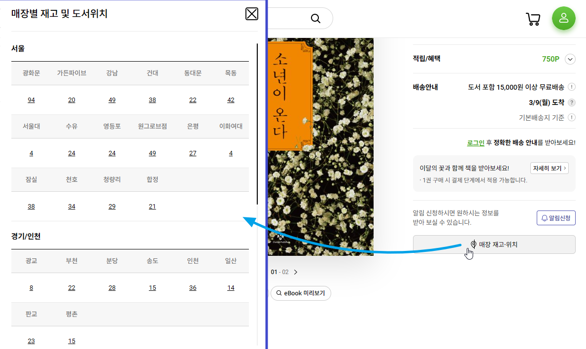 교보문고의 사례입니다. 책 상세 페이지에서 '매장 재고. 위치'를 눌렀을 때 아래와 같이 조회됩니다.