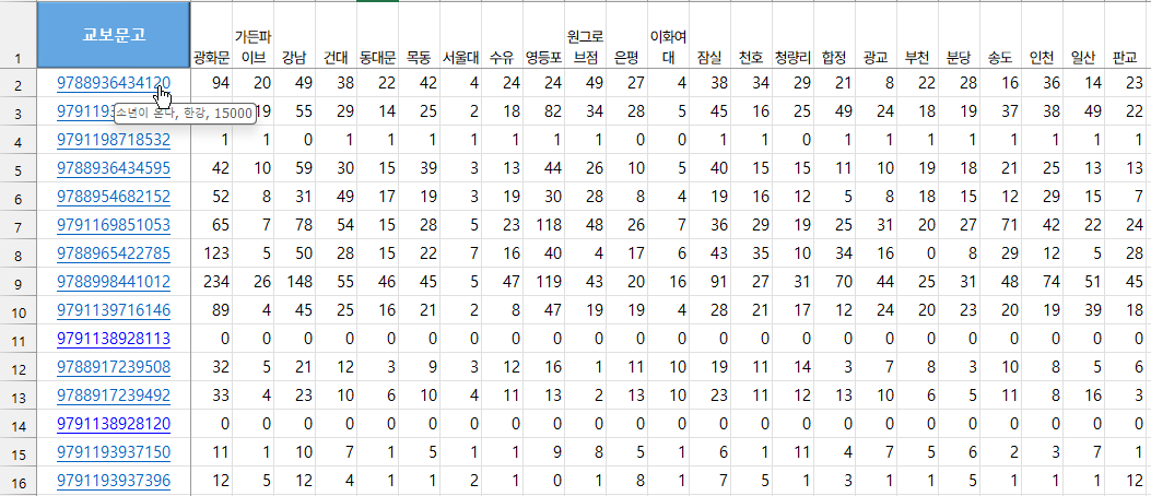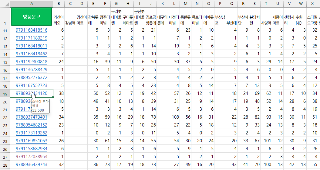 시트상에 나열된 ISBN 목록에 대해 각 지점의 재고현황 데이터를 JSON 형식으로 받아서