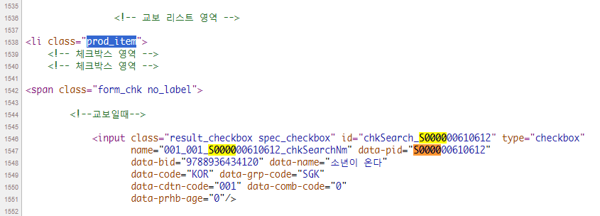 위 처럼 접속해서 HTML 문서 상에 검색된 도서중에서 prod_item 목록 중 input 태그의 data-pid 속성값에 S000000610612 을 구할 수 있습니다. 물론 표지 이미지 파일명에서 가져올 수도 있습니다.