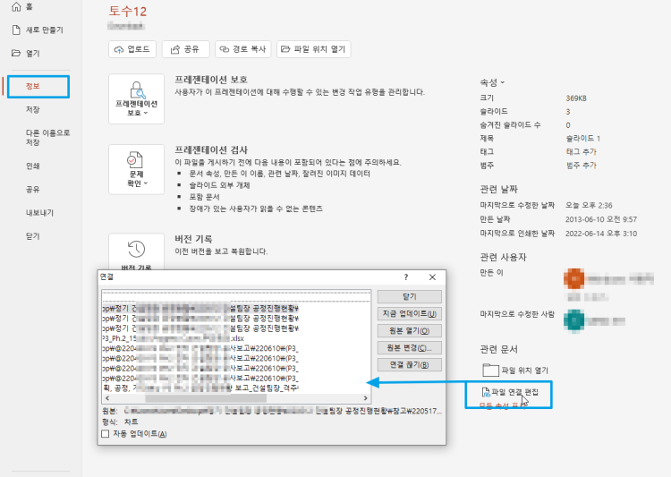 파워포인트에 삽입된 차트가 연결로 삽입되었다가 원본엑셀파일이 사라져서 엑셀 데이터를 수정하지 못할 때