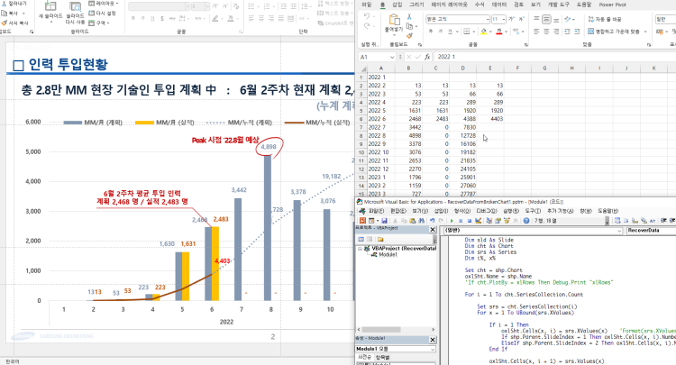 다만, 아래 VBA를 이용하면 파워포인트 차트에 남아있는 데이터를 이용해서 데이터 숫자는 복구해볼 수 있습니다.