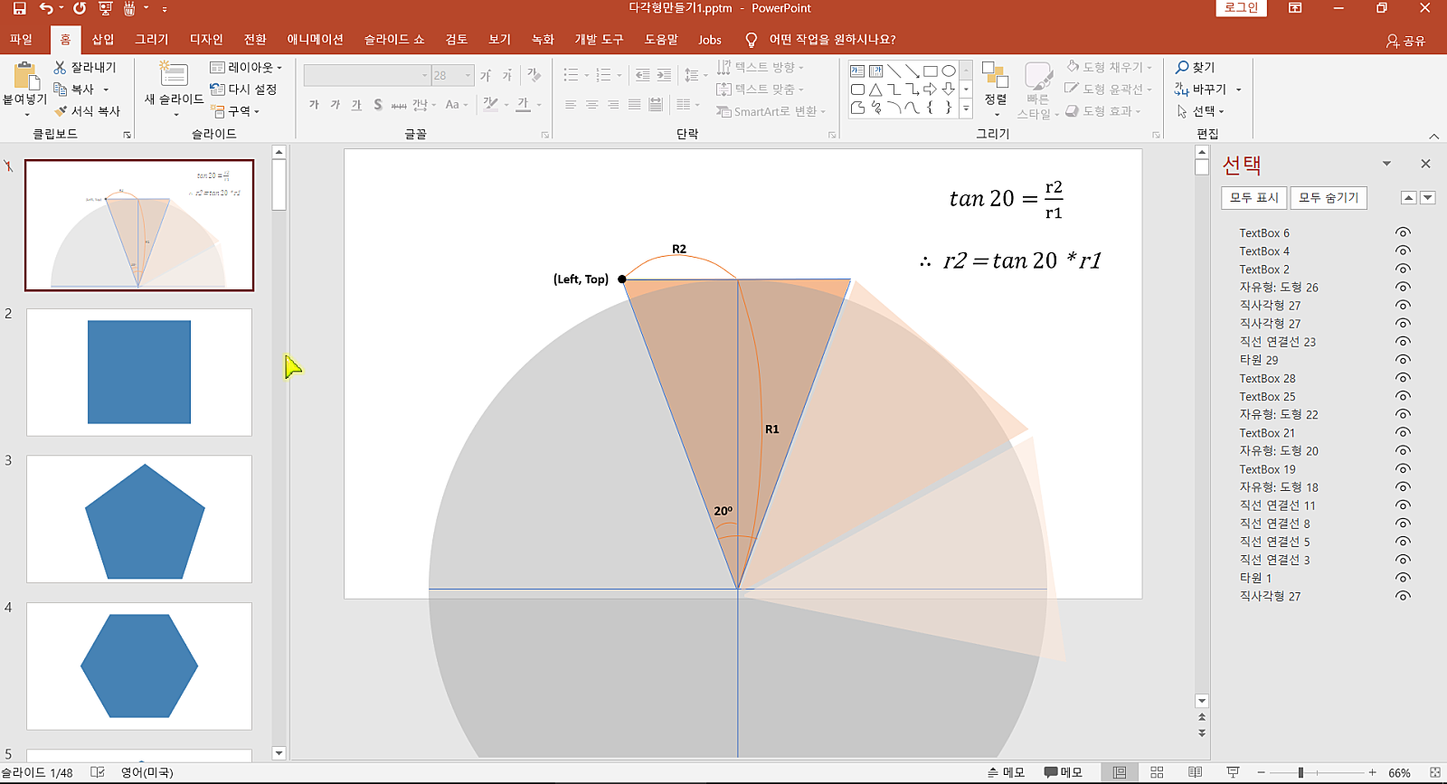 위 코드를 실행하면 슬라이드를 계속 추가하면서 4각형부터 50각형까지 그려줍니다.