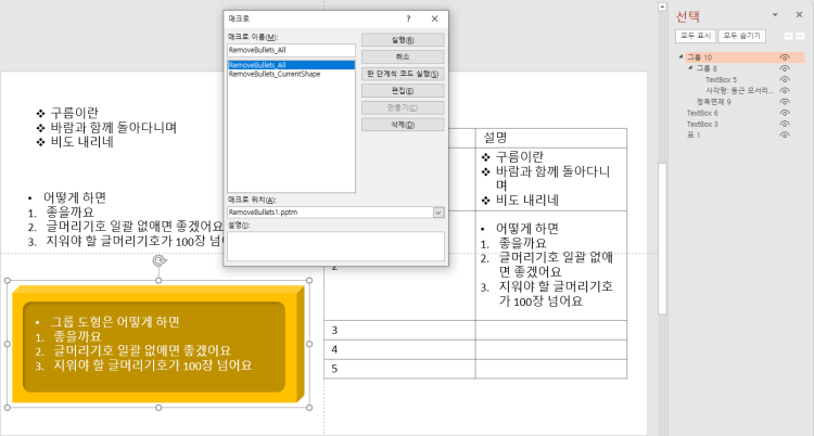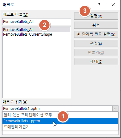 Alt-F8 매크로 창에서 매크로 위치를 먼저 첨부파일(RemoveBullet1.pptm)으로 지정해서