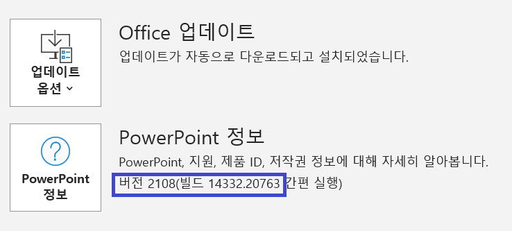 0. 파일 > 계정 에서 자신의 오피스의 현재 버전과 빌드를 확인합니다.