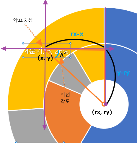 아래 그림에서 데이터라벨의 가운데 좌표(x, y)와 원의 중심 좌표(rx,ry)를 연결하는 선과