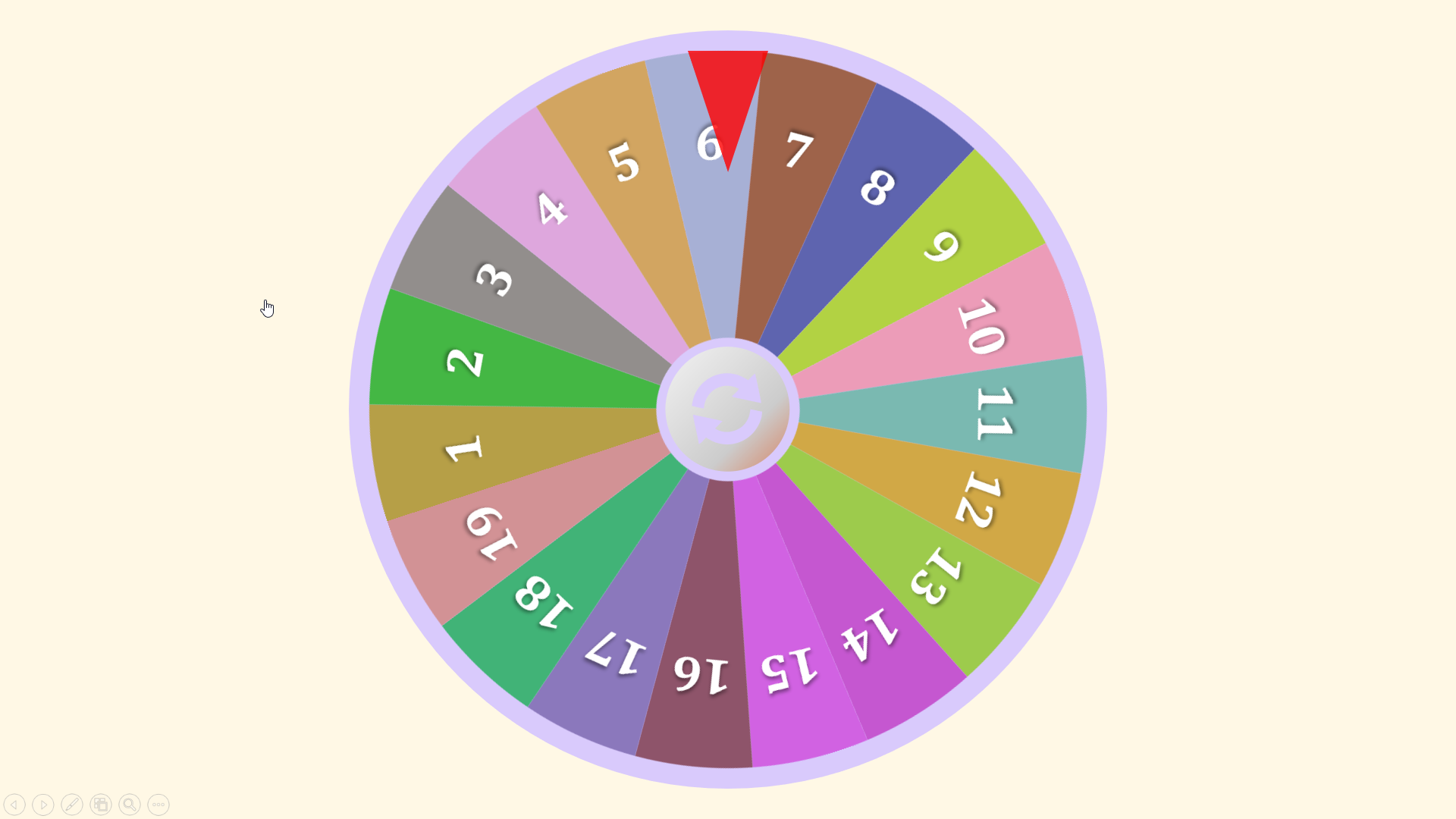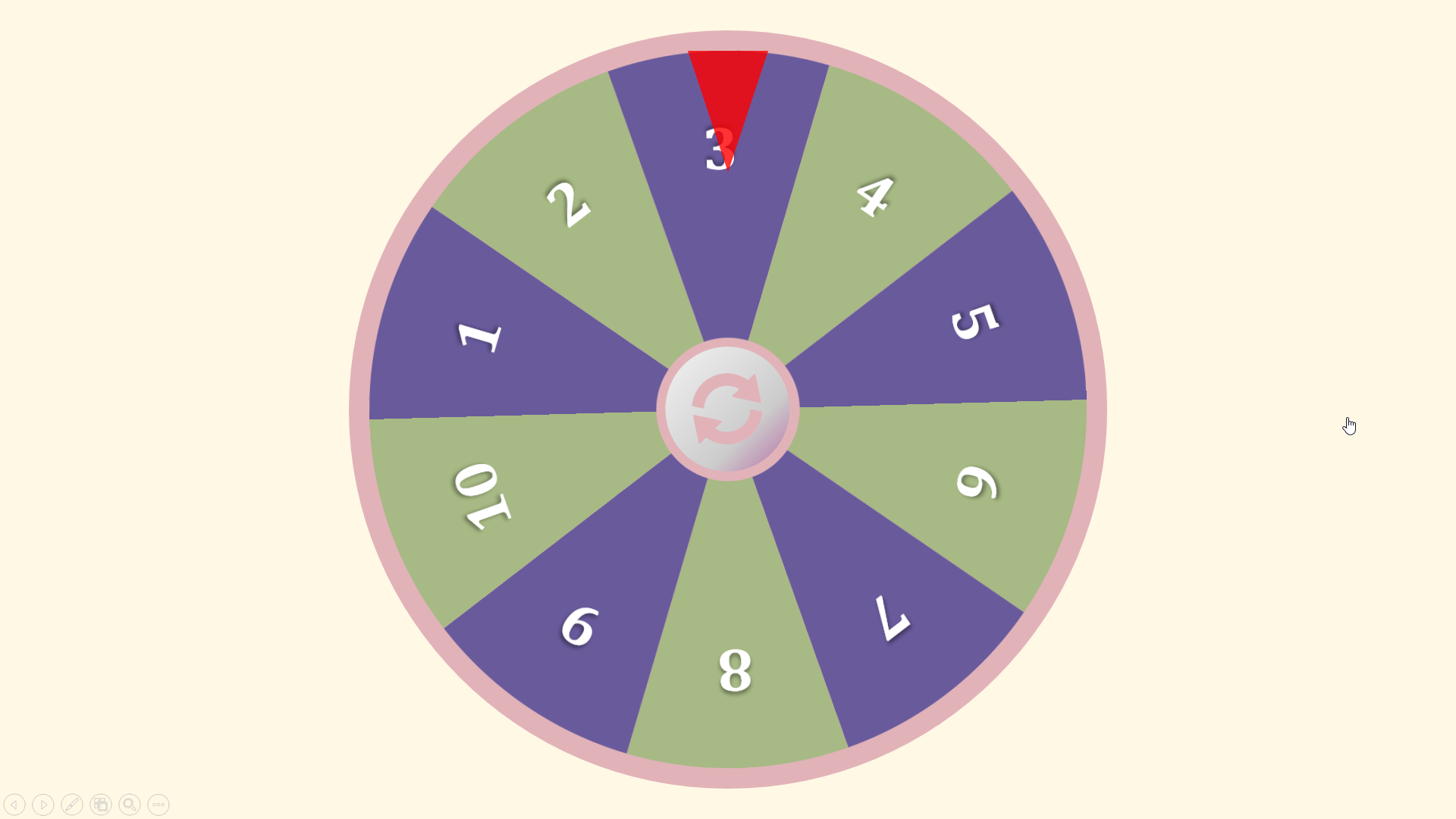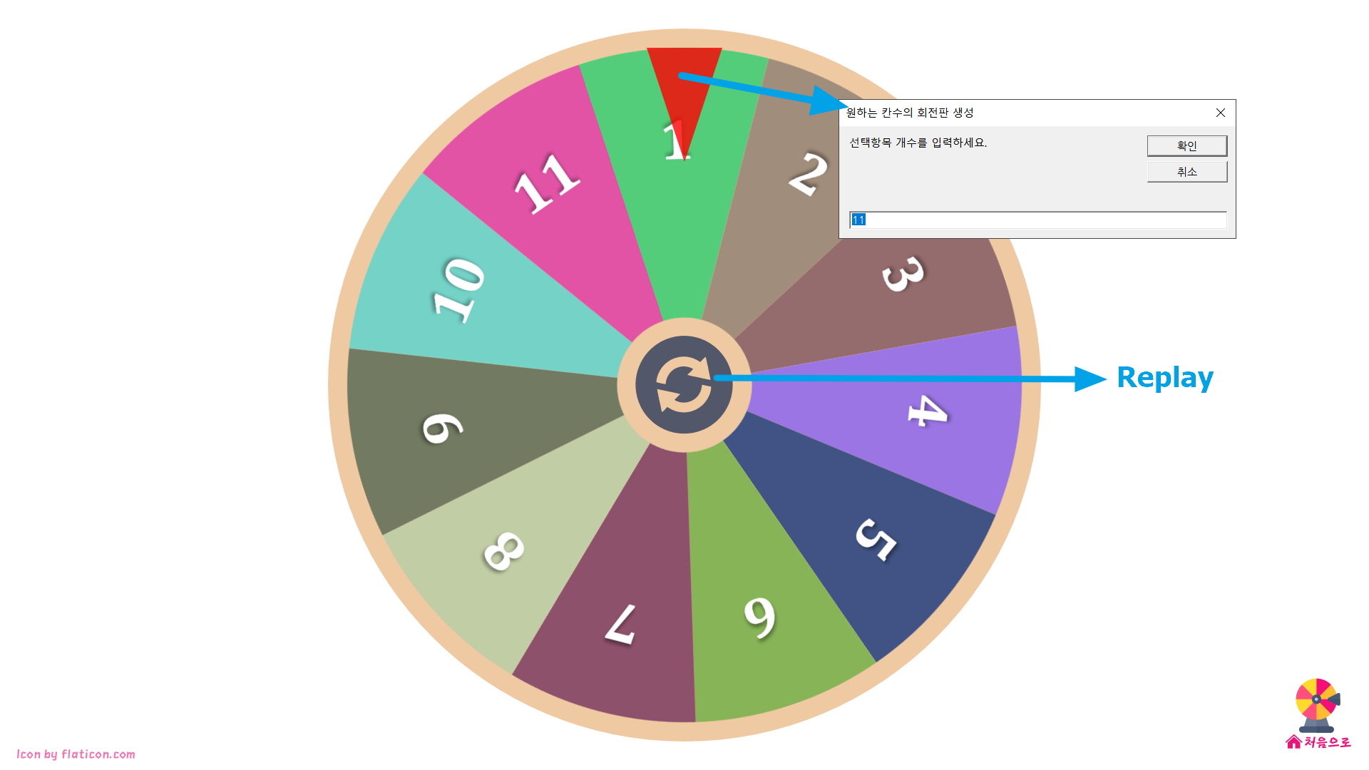 2슬라이드에 룰렛이 표시되고 회전하다가 자동으로 멈추므로 클릭할 필요가 없습니다. Replay 버튼은 현재 룰렛판을 다시 회전시킵니다. 회전 각도는 달라지므로 결과가 달라집니다. 빨간색 세모를 누르면 룰렛 개수를 입력받아 다시 새로운 룰렛회전판을 생성해서 회전시키고 자동으로 멈춥니다. 오른쪽 아래 홈버튼을 누르면 첫화면으로 돌아갑니다.