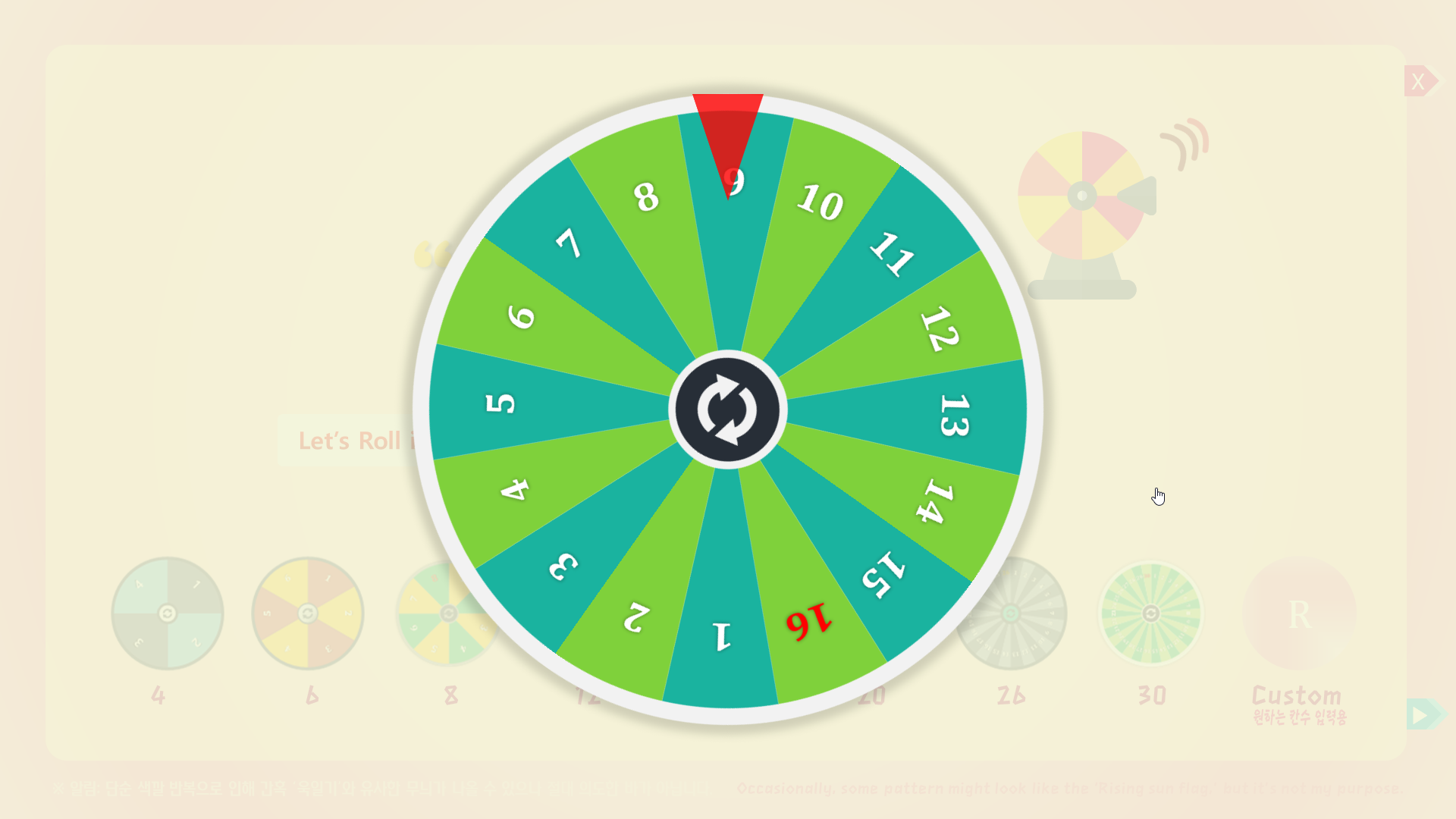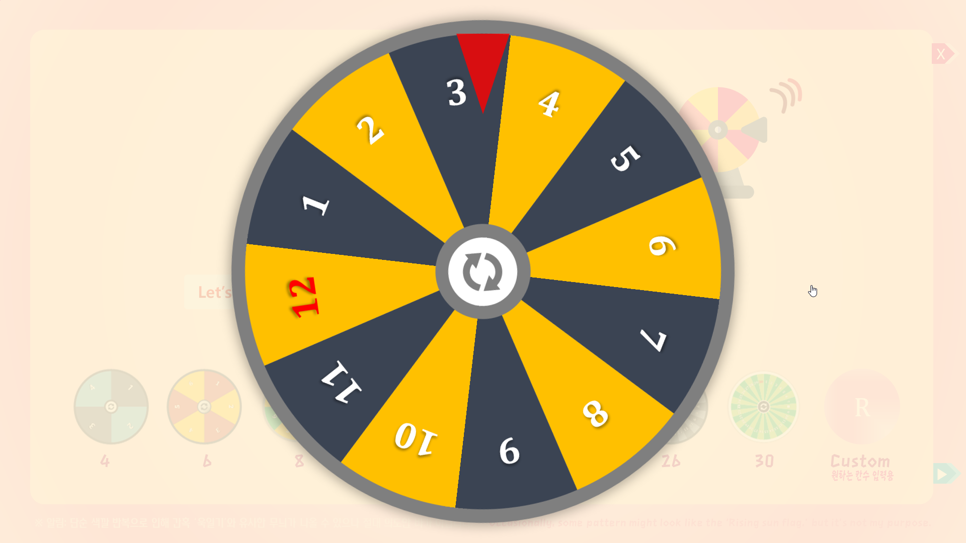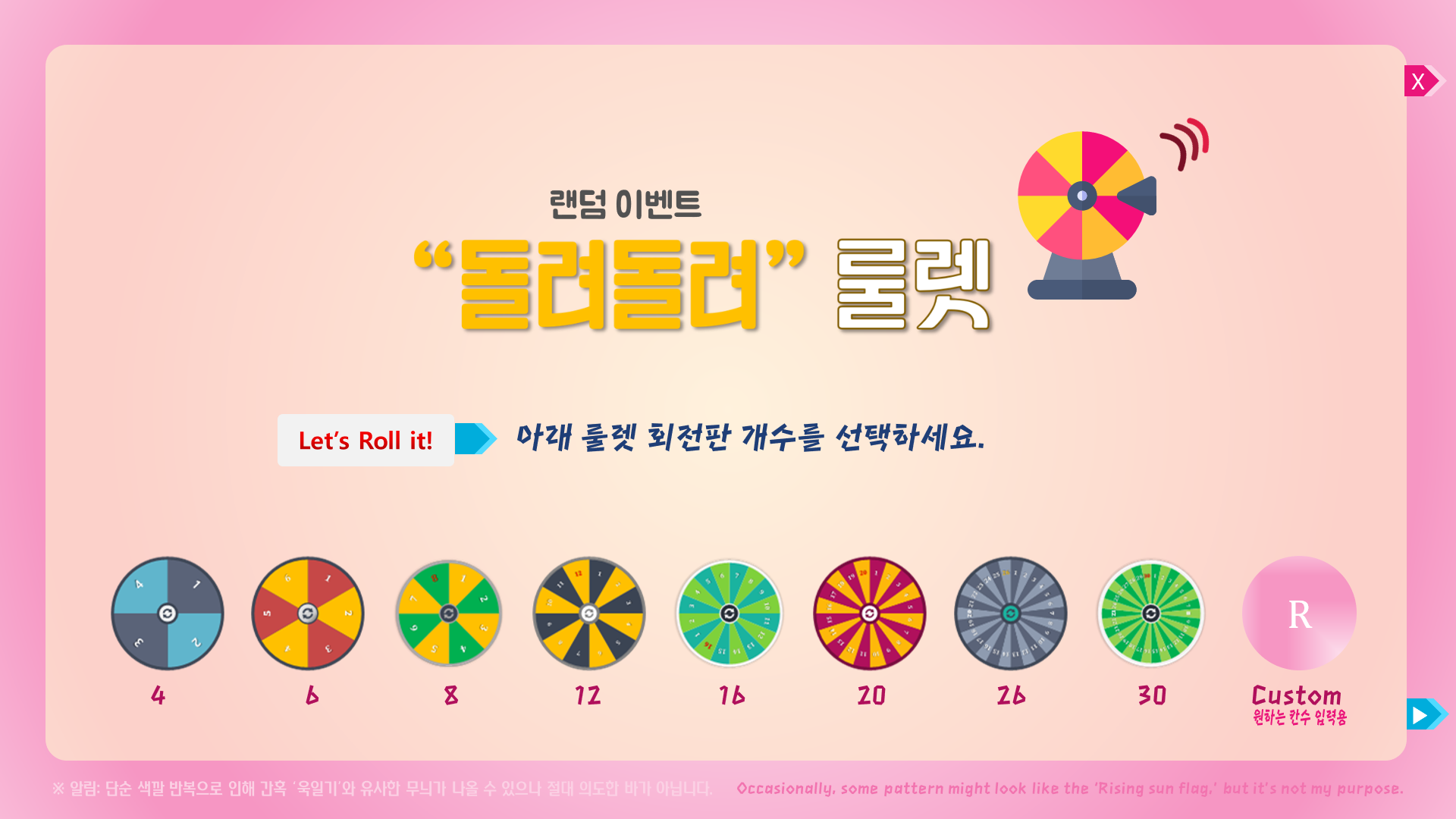 ** 알림: 회전판 개수가 짝수인 경우 단순 2가지 색깔 반복으로 인해 간혹, 일본제국주의 상징으로 알려진 '욱일기'와 흡사한 패턴이 나오기도 하는데 이것은 절대 의도한 것이 아닙니다. 자동 생성시에는 매번 색깔이 바뀝니다. **