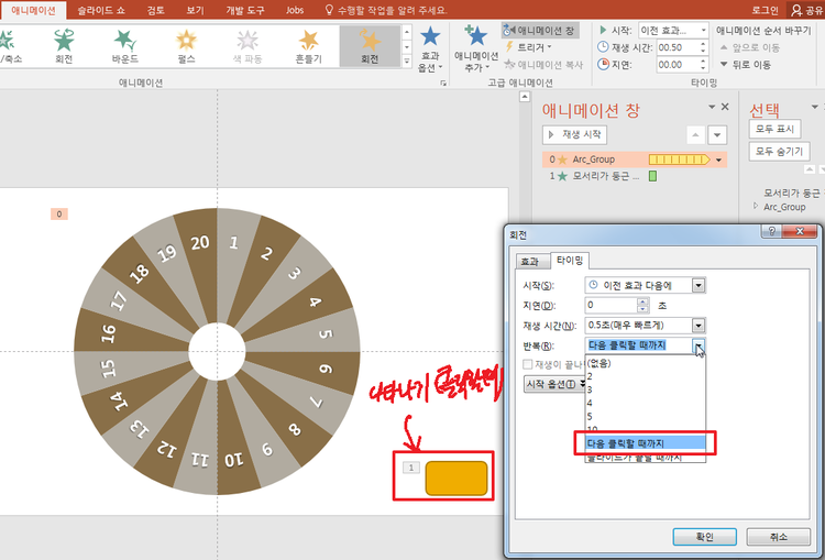 1-2. 회전판에 회전 효과를 추가하고 애니메이션 창에서 회전 애니메이션효과 우클릭 후 타이밍 속성에서 '다음 클릭할 때까지' 무한 반복시키고