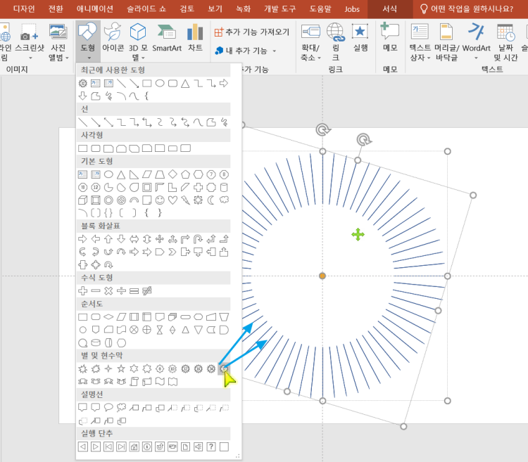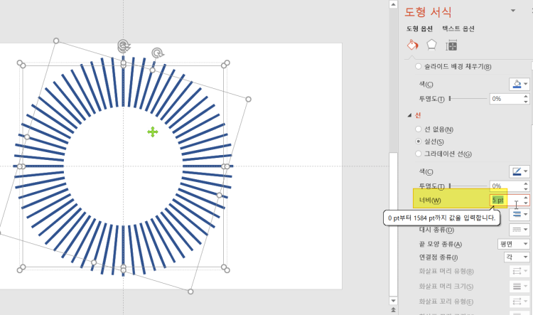안녕하세요 ppt 작업을 하고 있습니다. 원형 눈금을 그려야 합니다.눈금자가 지금 세로하고 가로밖에 안되고 대각선 밖에 안되요.대각선으로 해서 그려야지 원형 눈금자를 그릴 수 있을...