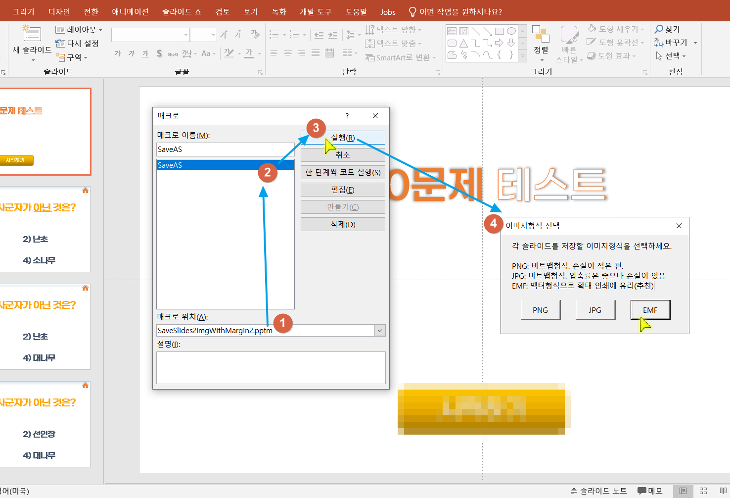 - PNG나 JPG로 각 슬라이드를 임시로 저장할 때 가로 3072px로 저장합니다. 파워포인트 버전 2019나 365등에서 더 높은 비트맵 해상도를 원하면 nWidth 값을 8192 등으로 높힐 수 있습니다. EMF 는 확대가 가능한 벡터방식이라 따로 지정할 필요가 없습니다. 인쇄용으로는 EMF방식을 추천합니다. 하지만 emf 내부에 텍스트가 들어 있는 경우 폰트가 없으면 글자가 원하는 폰트로 나오지 않을 수 있습니다.