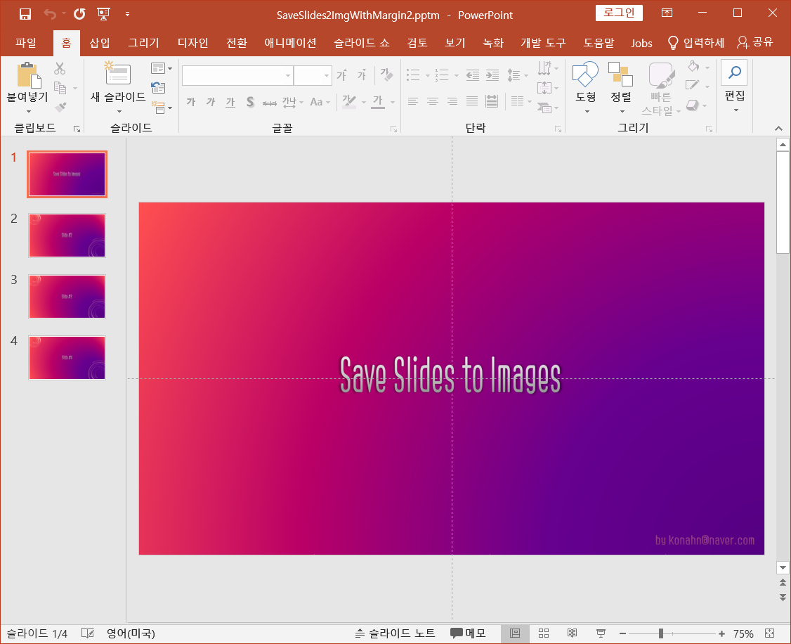 1. 일단 첨부한 pptm 매크로파일을 매크로 허용해서 엽니다.(외부에서 받은 pptm파일은 탐색기에서 파일 우클릭후 속성에서 '차단해제' 후 적용/확인 하는 것이 좋습니다.)