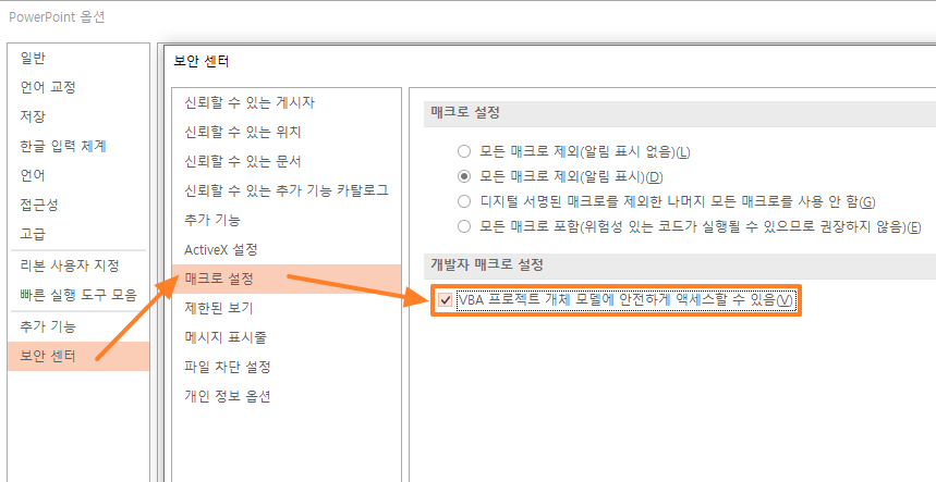 2. VBA코드까지 검색하기 때문에 PowerPoint 파워포인트 옵션-보안센터에서