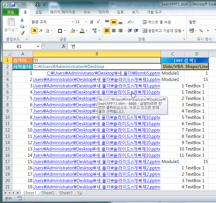 대상 파일의 전체경로와 파일명이 보이고 옆에 슬라이드번호와 개체이름이 나옵니다.