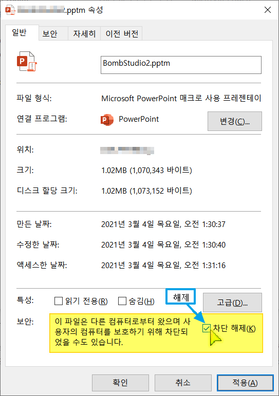 3. 검색되는 ppt 파일 자체에 제한이 되어 있지 않도록 외부에서 받은 파일은 차단해제를 하세요.