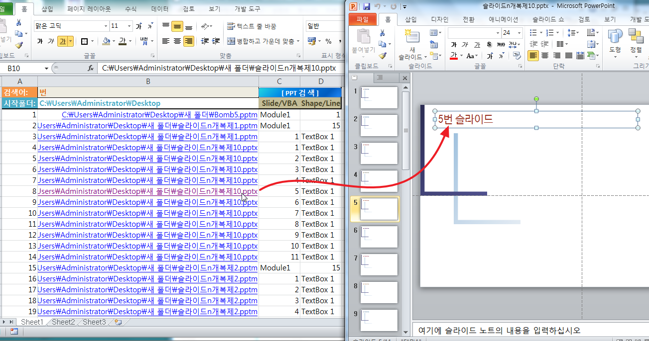 '검색 결과 해당된 파일의 해당슬라이드의 해당개체를 열어줍니다.