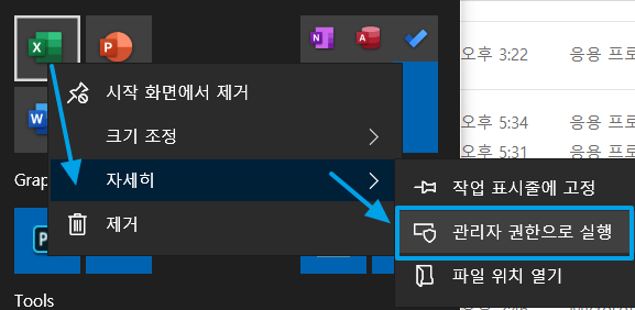 엑셀을 관리자로 실행해보세요. 아래처럼 엑셀 아이콘 우클릭하고 관리자 권한으로 실행하세요.