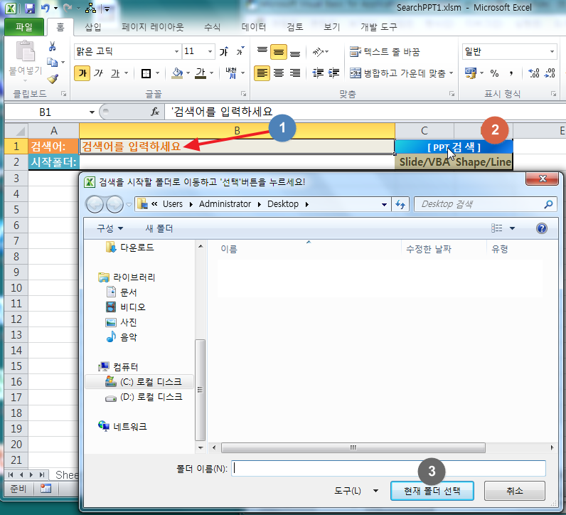 검색어를 입력하고 PPT검색버튼을 누르면 위 처럼 폴더를 선택하는 창이 뜹니다.