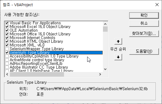 Alt-F11 도구 - 참조에서 아래처럼 Selenium Type Library에 체크해줍니다.