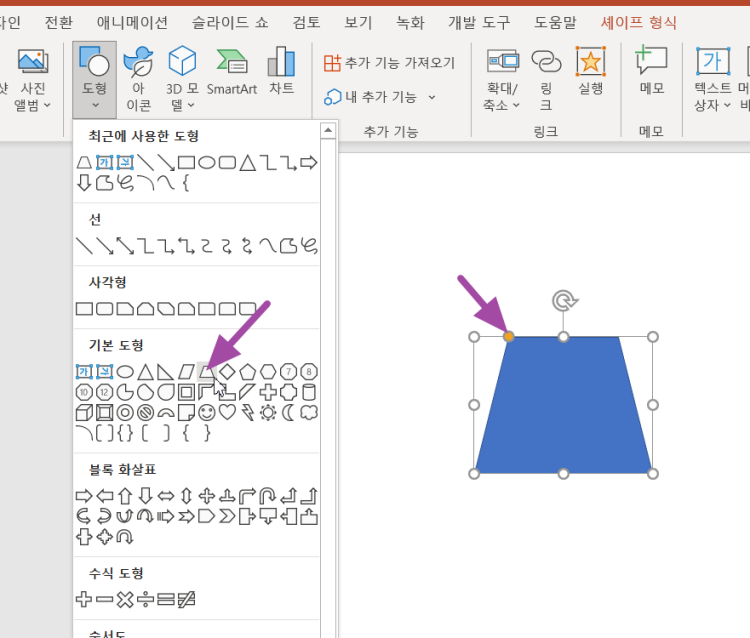 대칭이 되도록 만드는 것은 네모 도형을 하나 더 추가하고 기존 사다리꼴과 도형병합(교차 혹은 조각)를 실행해서