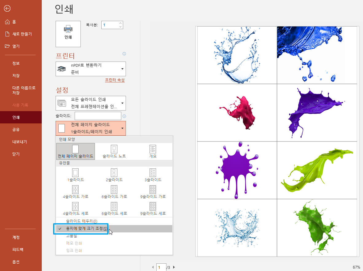 인쇄할 때는 전체페이지 슬라이드를 누르고 '용지에 맞게 크기 조정'에 체크하는 것이 일반적으로 더 크게 출력됩니다.