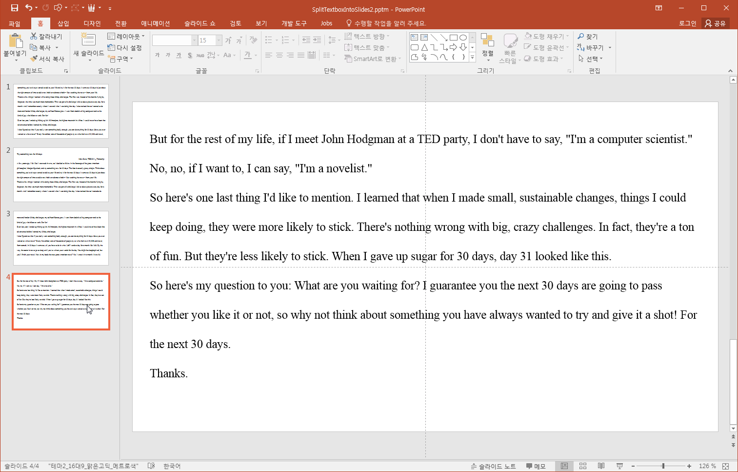 4. 실행 결과입니다. 기존 슬라이드는 다음에 새로운 분할 슬라이드가 생성되니 기존 슬라이드는 삭제해도 되겠습니다.