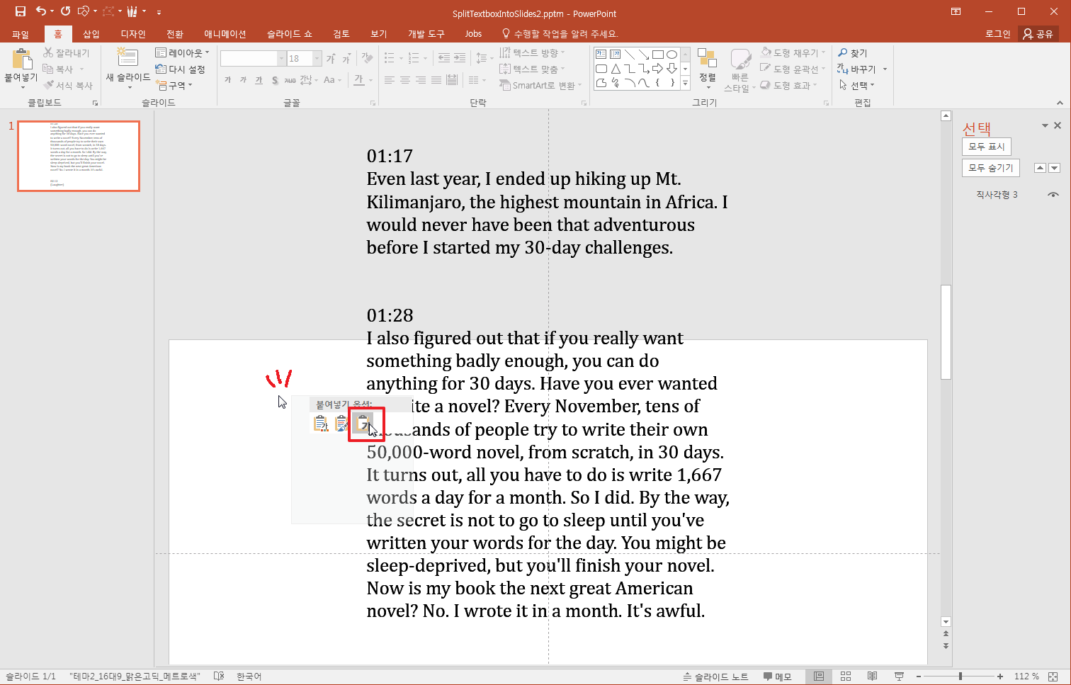 인터넷 등에서 텍스트를 가져와서 파워포인트 슬라이드에 붙여넣는 경우