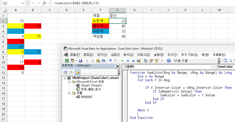 =SumColor(범위, 기준색상셀) 형식입니다.