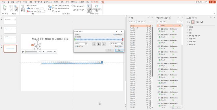 일반 애니메이션으로 해도 되지만 오디오 책갈피를 이용하면 장점이 많습니다.
