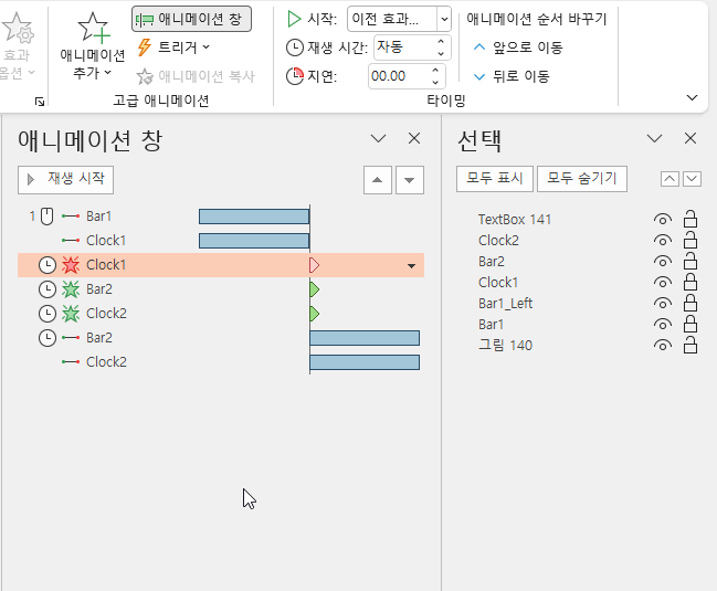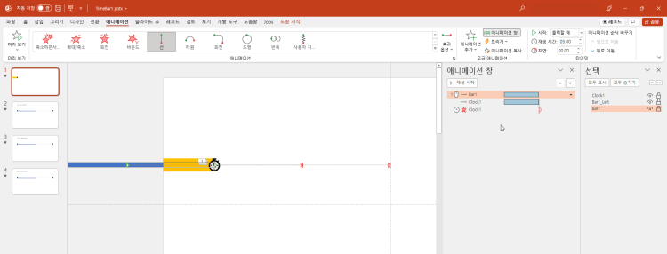 3. 각 책갈피마다 타이머 바에 해당하는 네모 도형이 차례로 나타나게 애니메이션 트리거를 추가 합니다.