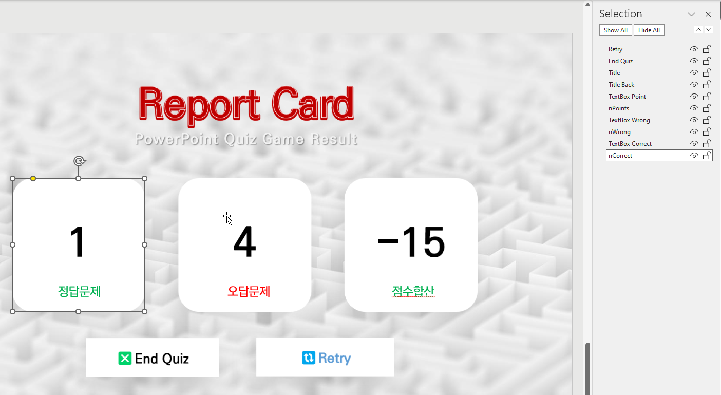 맨 마지막 슬라이드에서 퀴즈 결과를 표시합니다.
