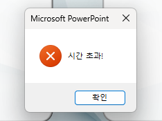 - - 각 문제 슬라이드마다 시간초과 메시지가 있는 슬라이드를 삽입하는 방법도 있겠습니다. 시간이 초과되면 바로 다음 시간초과 슬라이드로 이동하고 문제 정답을 맞추거나 오답을 선택하면 시간초과 슬라이드를 건너뛰고 다음 문제 슬라이드로 넘어가게 하는 것입니다. 이 방법이 가장 무난한 처리 방법이 되겠습니다.