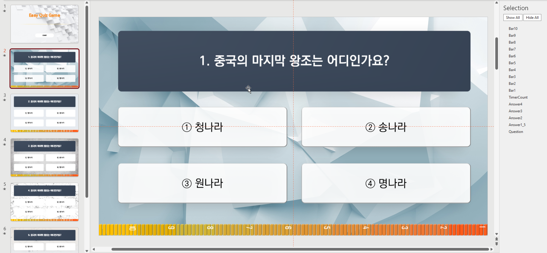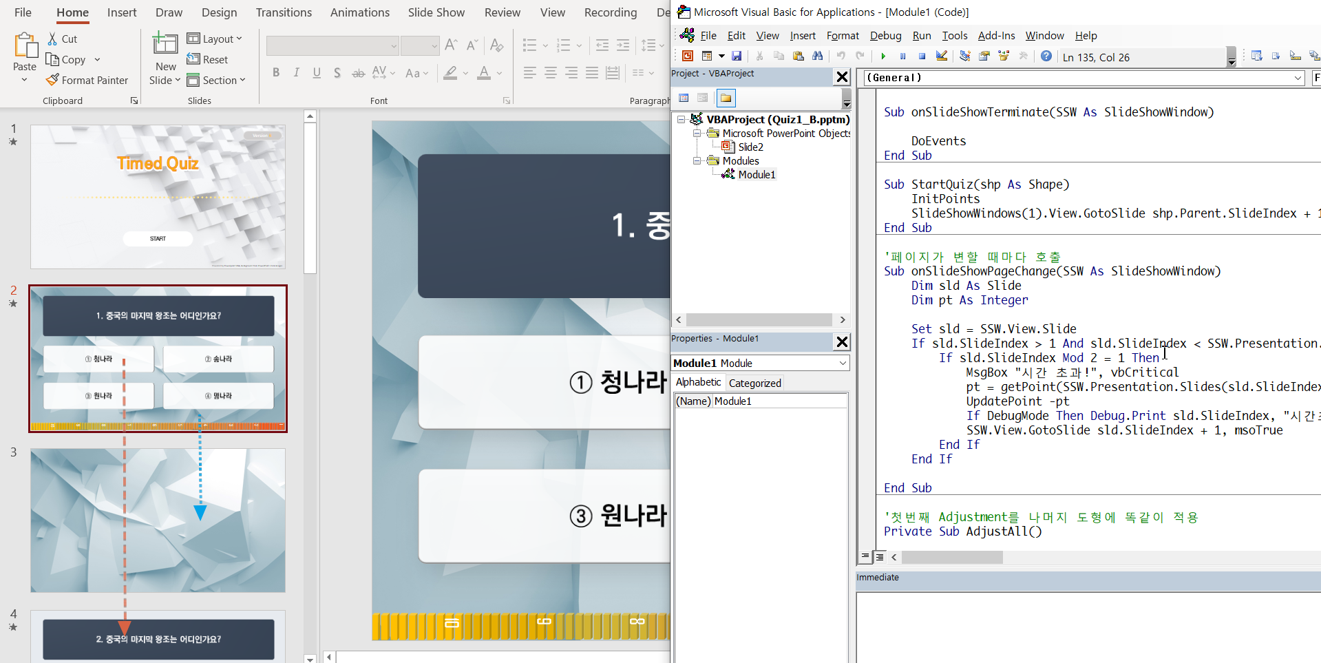 - VBA코드를 줄이고 문제 사이에 빈슬라이드를 이용한 버전: