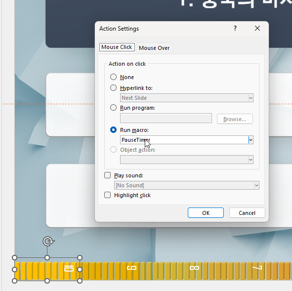 - - 슬라이드쇼 시작부터 VBA Timer로 약 0.25초 간격으로 시간을 체크할 수 있겠으나 이 경우 안정적이지 못하고 DoEvents 를 해주어도 쇼 진행이 버벅이고 제대로 컨트롤 할 수 없습니다.