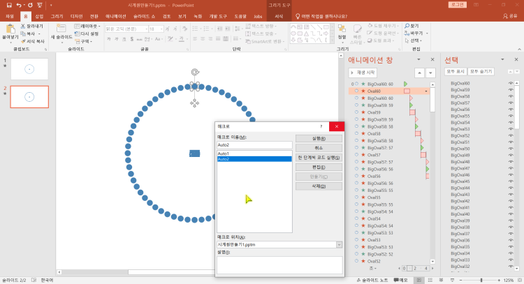 첨부파일 1의 슬라이드2: 작은 원을 그려서 애니에미션 효과 적용(Auto2매크로)