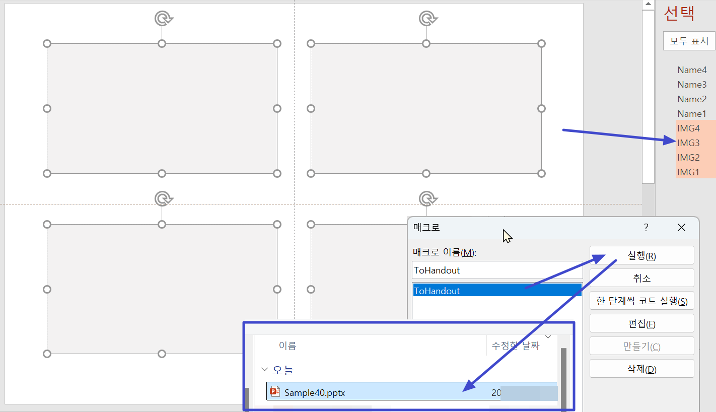 4. 준비가 되었으면 Alt+F8을 누르고 매크로 ToHandout를 실행합니다.