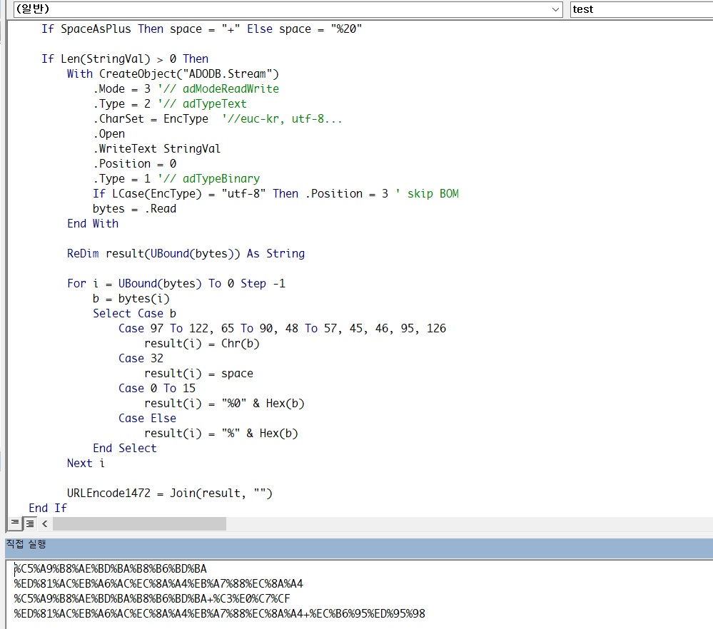 VBA에서 텍스트를 URLEncode/URLDecode 하는 것은 아래 함수를 이용할 수 있습니다.
