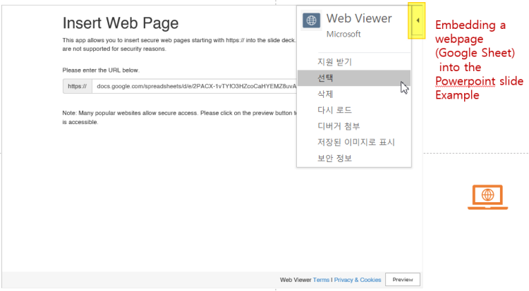 이 경우 파워포인트 온라인 추가기능중 Web Viewer 라는 추가기능을 이용해볼 수 있습니다.