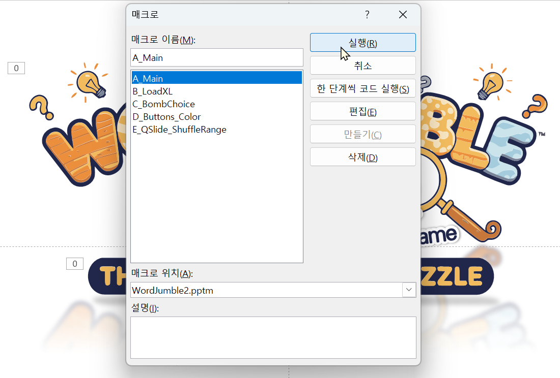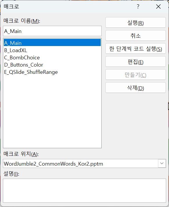Alt+F8누르면 아래와 같은 매크로를 실행할 수 있습니다.