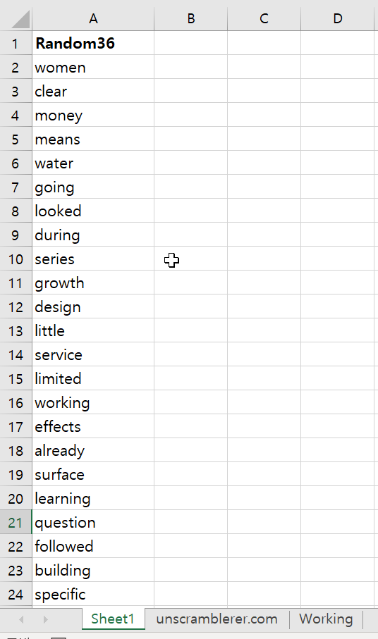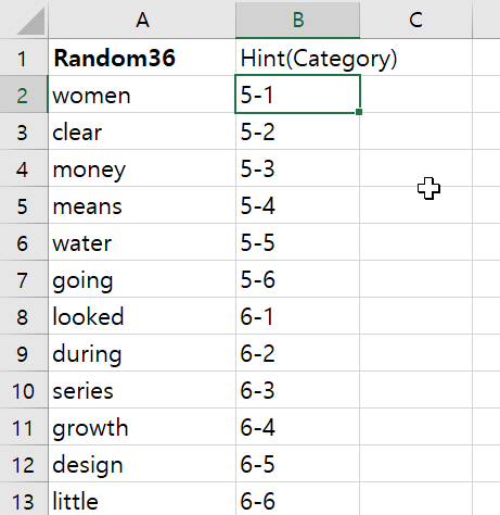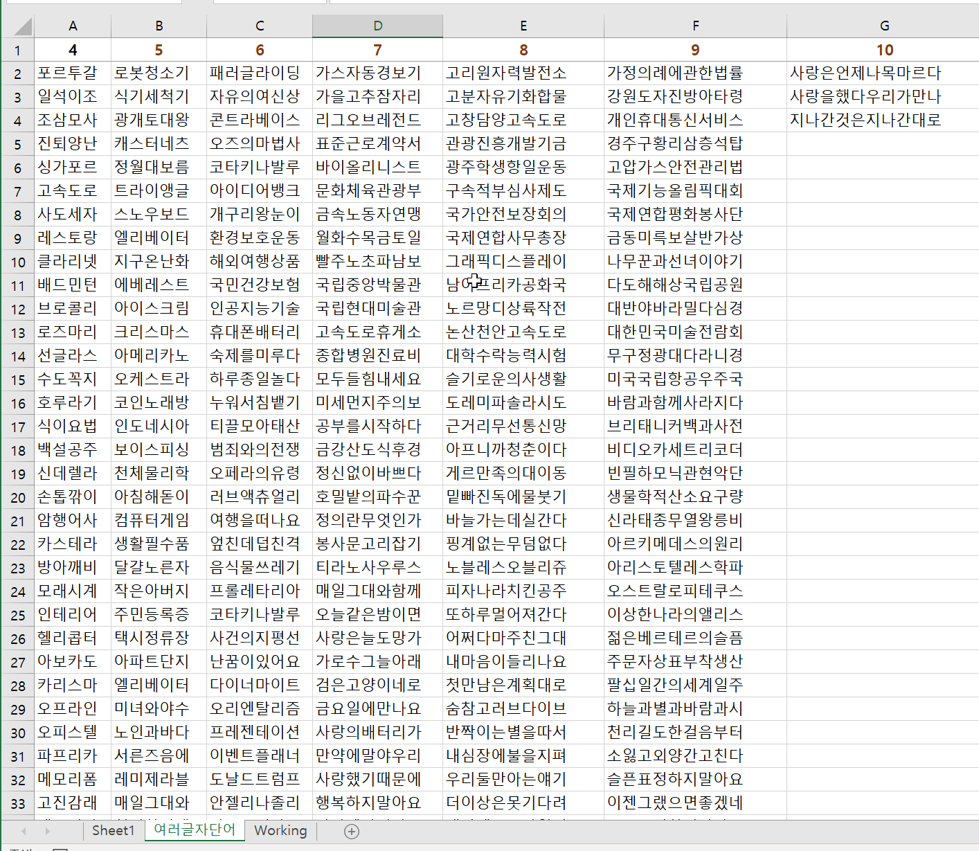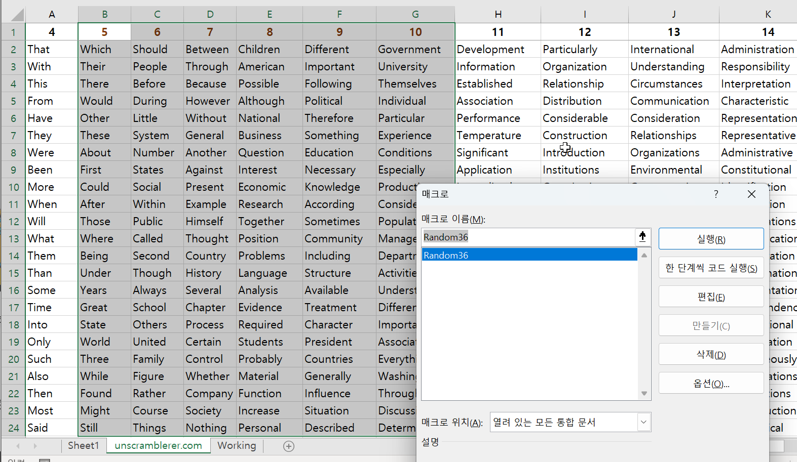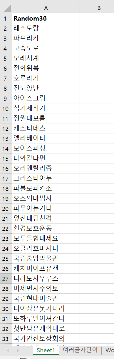 아래와 같은 목록에서 Alt+F8 > Random36을 실행하면 Sheet1에 단어목록을 생성합니다.